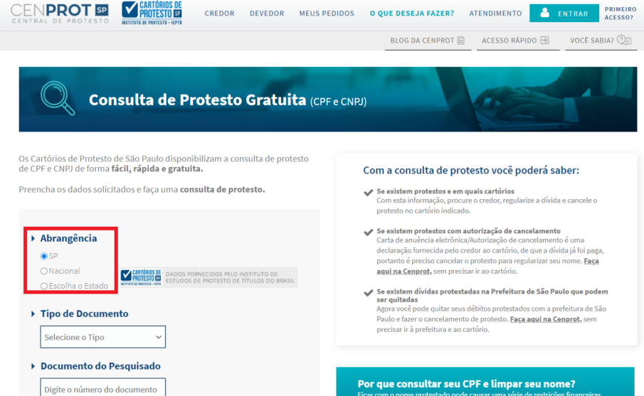 Além disso, no site da Central de Protestos de São Paulo (CENPROT), também é possível fazer uma consulta online, e clicar nas opções para checar seu nome no estado de São Paulo, ou em outro estado.